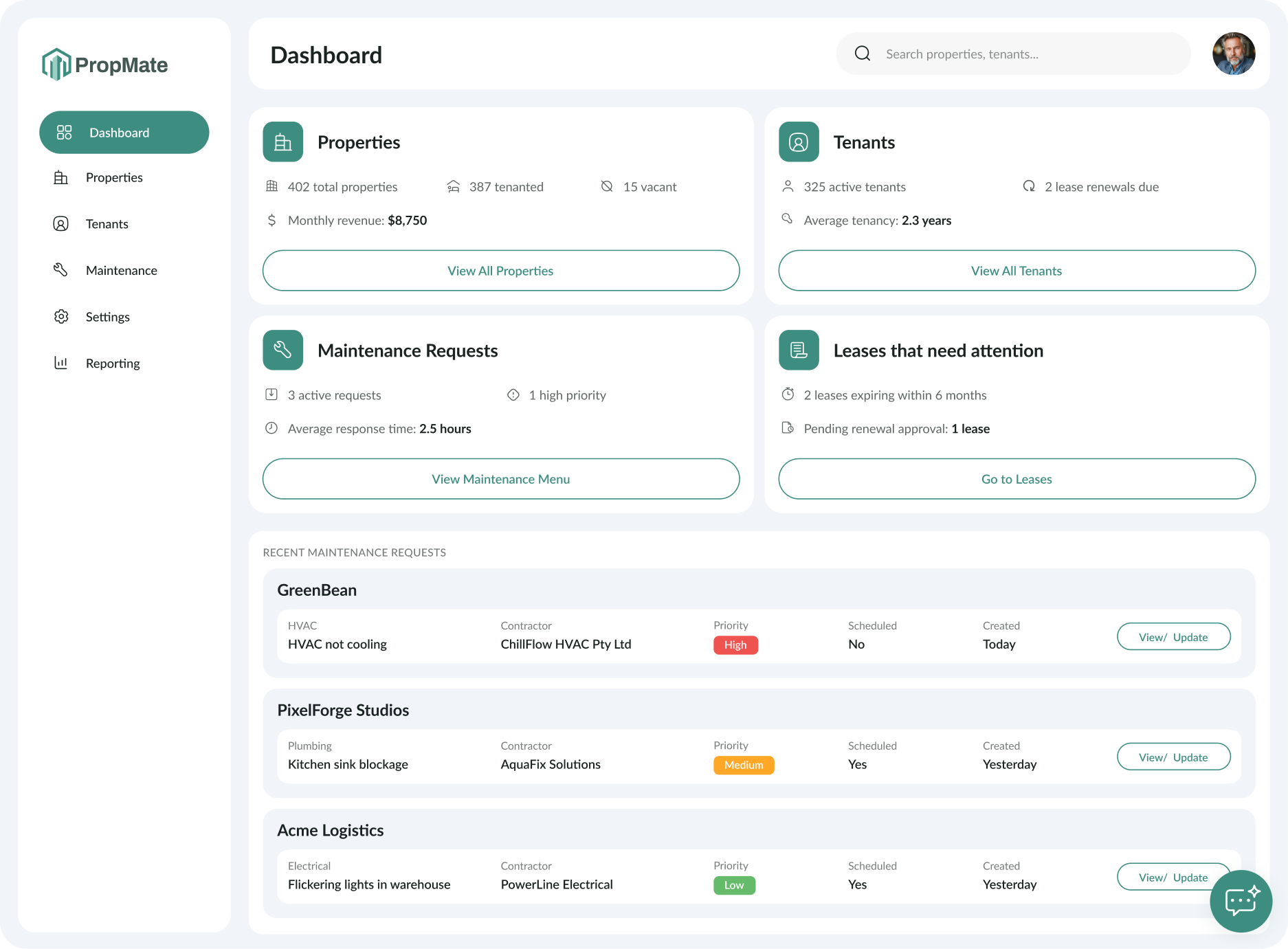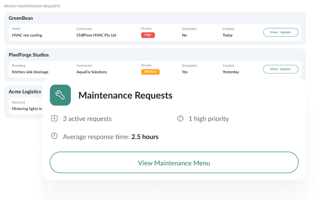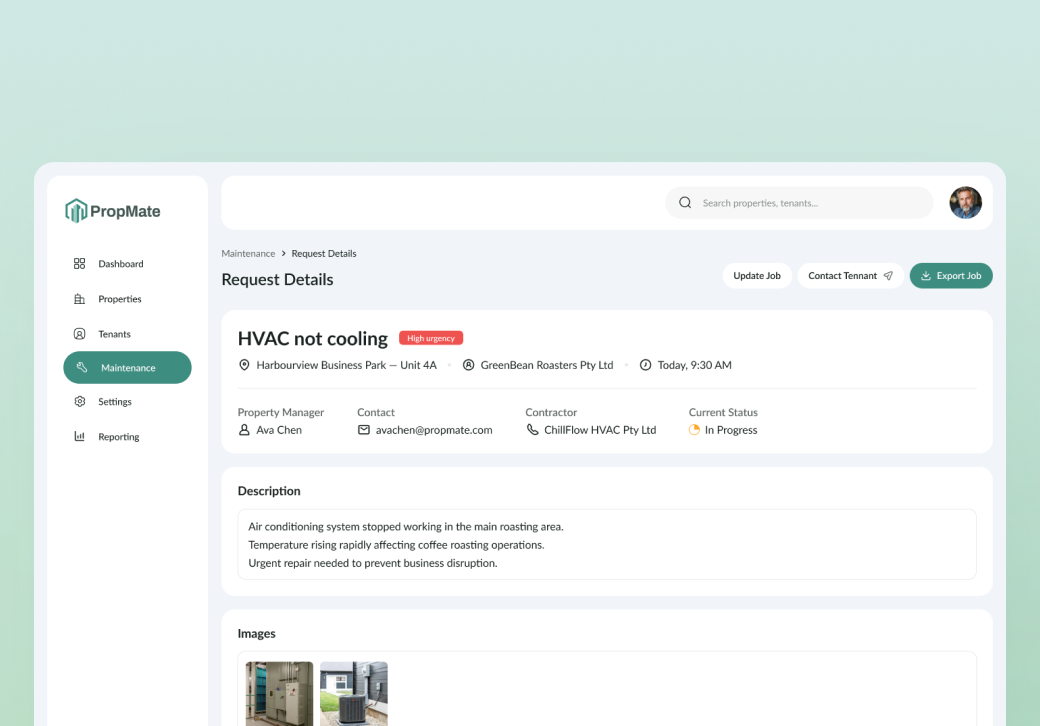 Propmate automates the flow of maintenance requests from tenant to contractor to finalised with the system triaging and assigning jobs to the right teams